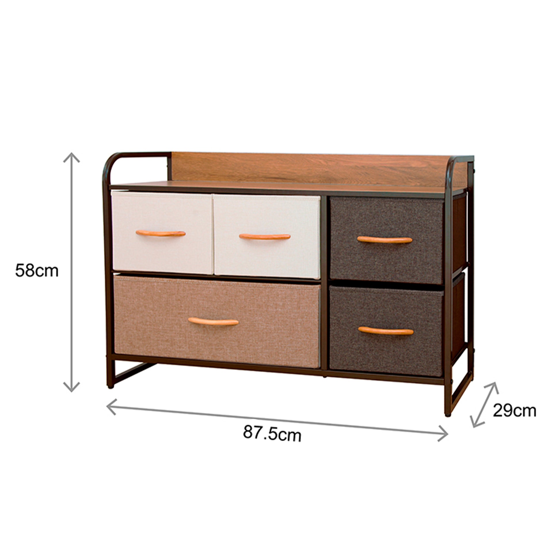 En Carry All preocupados de optimizar y ordenar tus espacios, pero con buen gusto, hemos lanzado esta cajonera de alta calidad, con 5 cajones, armazón metálico, cubierta de madera y cajones plegables recubiertos en tela premium que te ayudará a decorar tus espacios.