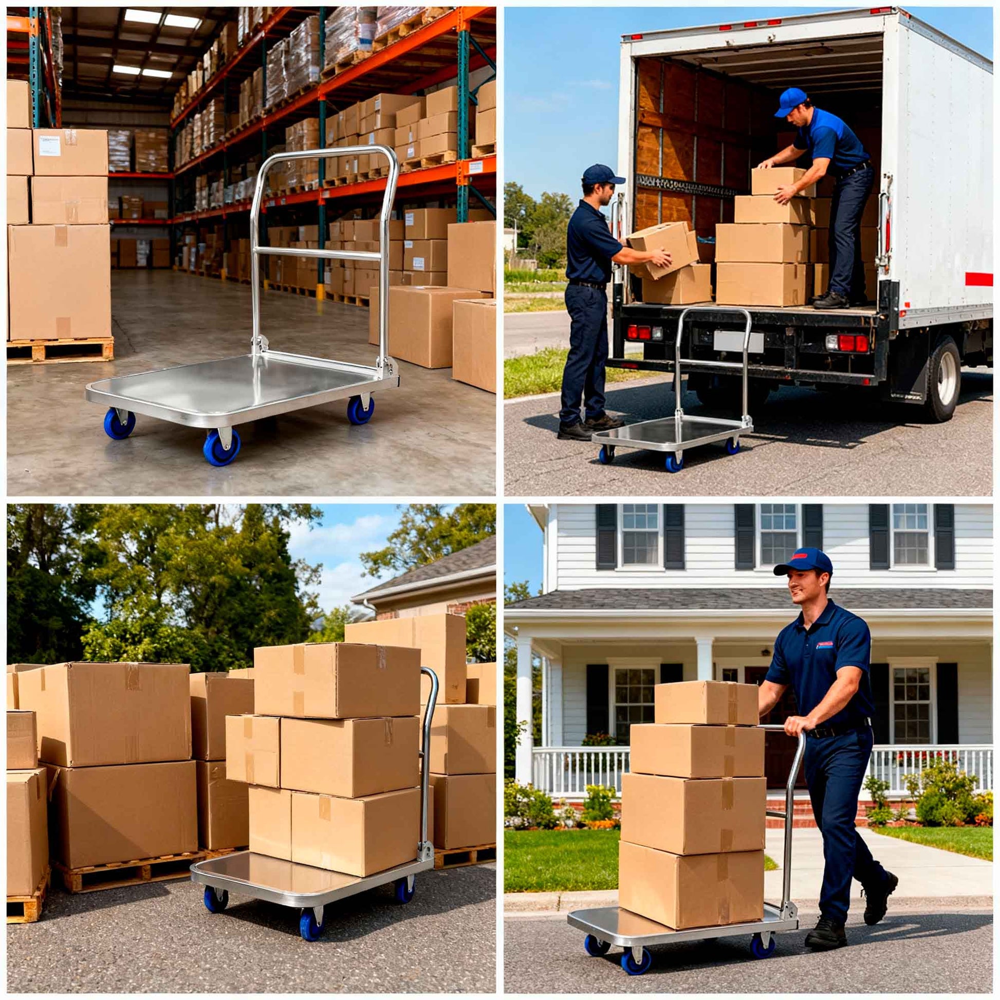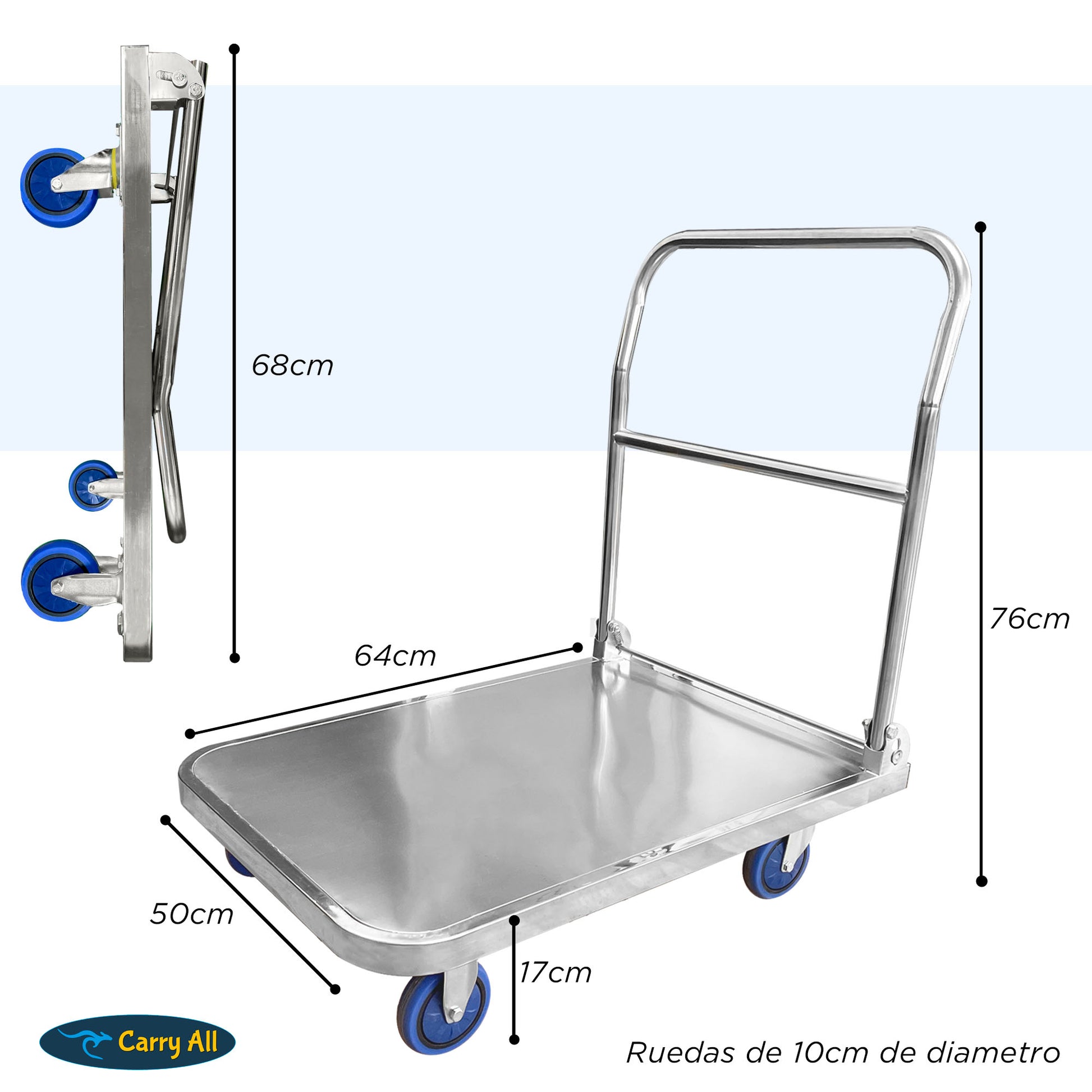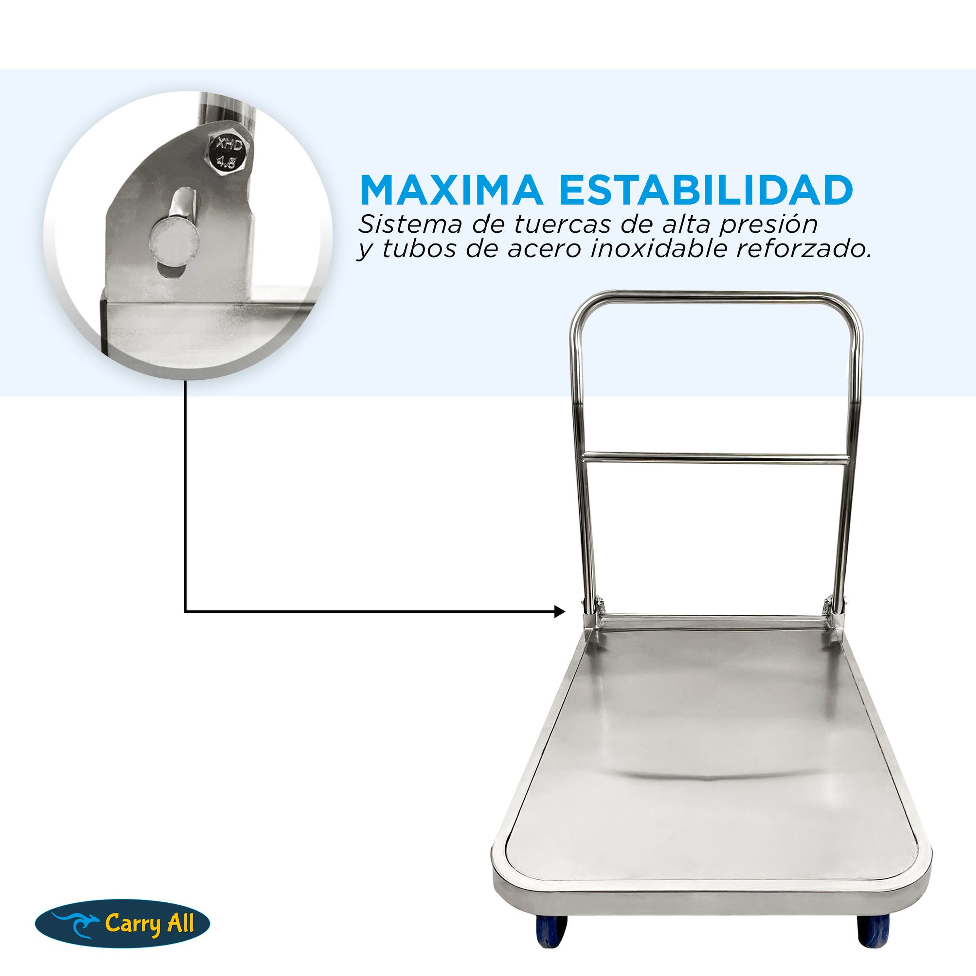 Elaborado con materiales de alta calidad, nuestro carro de mano tipo plataforma está hecho de acero inoxidable con armazón reforzada, resistente y duradera que aporta una fuerza más uniforme evitando que la plataforma se deforme fácilmente.